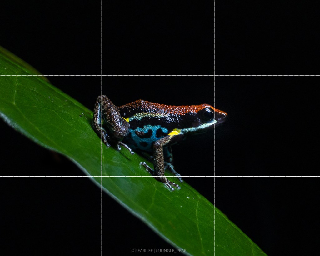 The same photo of the Ecuador Poison Frog (Ameerega bilinguis) [above] was cropped differently. The photo on the left positions the frog dead center of the frame whereas the photo on the right was cropped with the rule of thirds in mind.